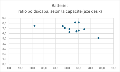 - Nota : Pour calculer les EC de fabrication de la carcasse (voiture hors batterie) (voir plus haut), il faut disposer du poids de la batterie pour la soustraire du poids total du véhicule. Quand ce poids n’est pas connu, on l’estime sur la base d’un ratio « poids moyen/ KWH de capacité ». Pour cela, on a pris les 12 VE les plus vendus, leurs batteries (poids et capacité) et on a fait la moyenne Kg batterie / KWH capacité et retenu le chiffre moyen de 7,0 kg/kWh