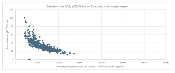 - Dès que les trajets entre le pays fabrication et la France sont significatives, nous considérons que l’approche de la France a été faite par bateau. Dans le cas contraire, nous faisons l’hypothèse d’un transport ferroviaire entre le pays et la France. Pour les transports par bateau, Kandeel s’est appuyé sur une étude (auditée) réalisée par CLDN en 2022 sur les émissions de CO2 des navires déclarés dans l’UE en 2022. Nous prenons la valeur moyenne qui se dégage du graphique ci-dessous soit 35 g de CO2 par tonne*km.
